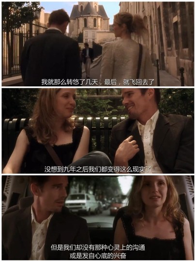 🎬爱在日落黄昏时丨2004丨80 mins 🇺🇸【美】理查德·林克莱特/编+导 ↓↓ 『一部靠对白取胜的爱情文艺片』【8.8/10】 (影感3.6丨表达2.5丨表演1.8丨美感0.9) · 🎞️观影笔记 ↓↓ 0️⃣整体感受 结尾恰到好处,延续了第一部大量对白的特色,只是这次的聊天话题更加现实,叠加了九年的生命经历后,各自都积蓄了许多情绪。 · 再次重逢,男女已然褪去了当初的青涩和热情,短暂的寒暄试探过后,大量的现实话题交代各自的世界观,随后过渡到个人生活。 · 时间是无情的,大量流淌着的现实经历,不断冲刷着彼此对于浪漫的认知,令人稍许安慰的,或许只有彼此信任袒露心声的默契啦。 · 爱在三部曲,其中的『爱在』另有所指,我想了想,也可以是出现在人生命中的短暂知心时刻,简单的陪伴,却能牵扯出万千思绪。 · 1️⃣影感【3.6丨4分】 ①视听享受丨0.9分 ②镜头剪辑丨0.9分 ③场面调度丨0.9分 ④结构设计丨0.9分 · 2️⃣表达【2.5丨3分】 ①逻辑严密丨0.8分 ②情节出彩丨0.8分 ③主题深刻丨0.9分 · 3️⃣表演【1.8丨2分】 ①角色魅力丨0.9分 ②演技出众丨0.9分 · 4️⃣美感【0.9丨1分】 · 5️⃣写在最后 ↓↓ 生活是不浪漫的,但却值得浪漫地生活! ·